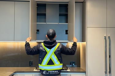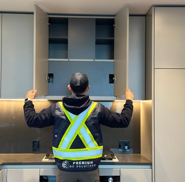 Cabinets: alignment, levelness, door/drawer operation, soft-close mechanisms, and secure mounting